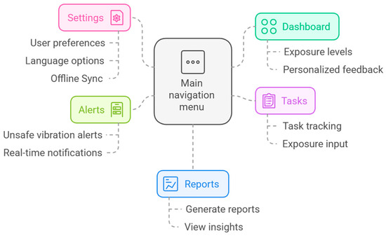 The navigation structure was designed to organize functionalities into distinct modules (Figure 10), ensuring intuitive user interaction and efficient risk management. The dashboard was conceptualized to provide real-time exposure insights on the basis of worker input and sensor data. The task module allows workers to log activities, track exposure, and report discomfort, improving data accuracy. Customizable reporting templates streamline this process, ensuring that all the risk factors are efficiently documented. The alerts module generates warnings when unsafe vibration levels are detected, enabling a proactive response. The report module generates exposure records and trend analyses, assisting in long-term safety planning, compliance tracking, and safety audits. Automated trend detection can identify recurring problems, helping safety managers prioritize hazardous vibration zones and implement specific measures. The settings module was designed to support adaptability across industries through language options, offline functionality, and accessibility features.