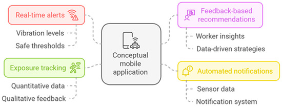 By combining worker-reported feedback with vibration data, this study provides a structured assessment of WBV risk. A standardized data collection framework was developed within the project, incorporating predefined questionnaires, daily work journals, and a conceptual mobile application, which enables the systematic collection and analysis of exposure-related information. The questionnaire is designed to collect information on physical discomfort, exposure duration, and worker perceptions of safety measures. The daily work journal documented real-time observations, offering a temporal perspective on workplace conditions. The conceptual mobile application is intended to integrate these data sources, allowing real-time monitoring and trend analysis to refine feedback collection and improve data reliability. The framework incorporated sensor-based data collection and automated processing, allowing vibration exposure trends to be analyzed in real time and compared with worker-reported discomfort levels. Built within this framework, the application serves as a framework for integrating worker feedback with vibration measurements to support workplace safety improvements. Although not yet developed, the application was designed to streamline data collection, support real-time monitoring, and facilitate proactive interventions. The design includes a data input system compatible with manual user entries and automated sensor-based measurements. It incorporates automated reminders, anonymized reporting, and real-time dashboards, ensuring efficient data collection while maintaining worker confidentiality. Anonymization was integrated to protect worker identity while enabling trend analysis across different work environments. The application was conceptualized to combine sensor-based vibration measurements with worker-reported data, providing a comprehensive assessment of exposure risk. The proposed system is intended to correlate vibration exposure and reported discomfort, helping workplaces to identify patterns and refine operational practices. This integration allows a correlation between objective vibration data and subjective worker experiences, offering a holistic view of WBV-related hazards. The proposed system is designed to analyze responses in real time, recognizing patterns that support timely task adjustments and exposure management. To improve accuracy, the proposed system incorporates advanced filtering and pattern recognition algorithms designed to refine high-risk scenario detection. Within this framework, real-time alerts would inform workers and supervisors when vibration levels exceed safe thresholds, prompting immediate corrective actions. Additionally, an adaptive task tracking module records daily exposure levels, identifies operational trends requiring intervention, and automatically generates reports on cumulative exposure trends, supporting data-driven decisions for task allocation and workplace adjustments.