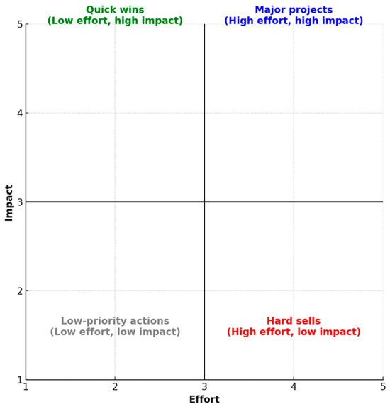 The impact–effort matrix (Figure 12) provides a structured approach to prioritizing interventions for managing workplace vibration exposure across different industries. By categorizing strategies on the basis of their impact and required implementation effort, organizations can allocate resources strategically while supporting that immediate and long-term interventions are managed. The findings indicate that preventive maintenance and real-time monitoring require minimal effort yet provide immediate benefits, whereas solutions such as ergonomic task redesign and vibration-dampening technologies demand greater investment but provide sustained improvements.