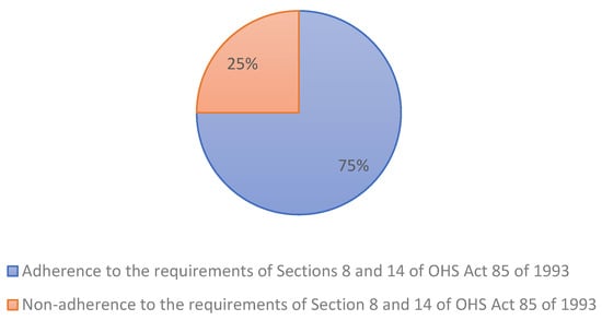 As shown in Figure 3, respondents indicated that 75% comply with the responsibilities outlined in Sections 8 and 14 of the Occupational Health and Safety (OHS) Act 85 of 1993, while 25% admitted to non-compliance. The reasons cited for these included inconsistencies in incident reporting, employee complacency towards hazards, and communication challenges. Ligade [29] asserts that the effectiveness of an OHS system relies on the commitment of all organizational levels and departments, with particular emphasis on the role of senior management. Similarly, Tappuraa [28] emphasizes that the employer bears the primary responsibility for ensuring the safety and health of workers and should lead OSH initiatives within the organization. This includes assigning clear roles, accountability, and authority for the development, implementation, and evaluation of the OHSMS to meet the organization’s OHS objectives. In cases where the requirements of Sections 8 and 14 were not met, respondents reported varying levels of compliance issues. These were often attributed to inconsistent incident reporting procedures, employee complacency regarding workplace hazards, communication breakdowns that hindered the effective dissemination of OHS procedures, and challenges related to infrastructure maintenance contributing to unsafe working conditions. These findings highlight the need for targeted improvements to ensure a thorough understanding and consistent implementation of the responsibilities outlined in Sections 8 and 14 of the OHS Act across all departments.