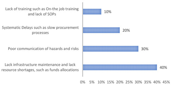 Respondents were allowed to select multiple challenges they had encountered in implementing the university’s occupational health and safety management system (OHSMS). As illustrated in Figure 4, the most commonly reported issue was a lack of infrastructure maintenance and resource shortages (40%), followed by poor communication of hazards and risks (30%), systematic delays such as slow procurement processes (20%), and a lack of training and standard operating procedures (SOPs) (10%). These findings reveal recurring challenges in both the operational and communication aspects of the OHSMS. In the South African context, communication issues are often intensified by language barriers, given the country’s eleven official languages [30]. Explaining or translating certain OHS terms into vernacular languages can be challenging, particularly for unskilled laborers [30]. This linguistic diversity underscores the need for clear and inclusive communication channels to ensure that critical safety information is effectively understood by all employees [30].