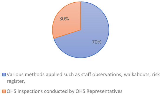 Section 8 of OHS Act 85 of 1993 requires an employer to establish, as far as is reasonably practicable, what hazards to the health and safety of persons are attached to any work that is performed and, as far as is practicable, to establish what precautionary measures should be taken to protect the health and safety of persons (OHS Act 85 of 1993). As illustrated in Figure 5, about 70% of respondents identified hazards through inspections by OHS representatives, while 30% used staff observations and walkabouts. Farmer [31] supports these proactive measures, demonstrating that 86% of respondents are aware of potential hazards in their work environment and consider hazard identification an integral part of their daily responsibilities.