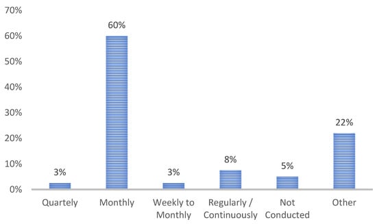 In this case, as illustrated in Figure 6, the majority of respondents reported that these assessments are conducted monthly, reflecting a commitment to ongoing safety monitoring. In contrast, a smaller group of 3% indicated that assessments are conducted both weekly and monthly in specific cases. On the other hand, 5% of respondents stated that no assessments are conducted at all, underscoring areas that may require increased attention. Additionally, 3% mentioned quarterly assessments, and 8% indicated that assessments are conducted regularly or continuously. The “other” category, encompassing 22% of respondents, includes those who were unsure and noted HIRA being conducted once, no review thereafter. According to Subhani [8], hazards and risk identification and assessment should be performed continuously to prevent, control, and reduce them in the future. While the data suggest a strong framework for regular hazard identification and assessment, there are areas where improvements could be made. Enhancing training and communication to ensure consistent assessment schedules across all departments and to address any neglected areas could further strengthen the university’s safety and health management system.