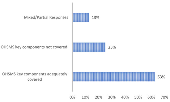 A comprehensive analysis of the university’s execution of the occupational health and safety management system (OHSMS) unveils crucial insights. In Figure 7, it is shown that 63% of respondents feel that the key components of the OHSMS framework are appropriately handled to uphold health and safety compliance, while 25% of respondents have raised concerns about the university’s non-compliance in implementing specific key components of the OHSMS framework. Additionally, 13% of respondents offered mixed or partial feedback in the study, without specifying the particular key components of the OHSMS framework that are only partially effective or deficient in certain aspects. Common challenges identified include inadequate hazard identification, poor infrastructure maintenance, delayed resource allocation, and weak operational controls, particularly in procurement and maintenance processes. These findings echo Mohammedi’s [5] study, which highlighted functional performance and contractor management as persistent issues in OHSMS implementation. Additional concerns included insufficient training (e.g., fire extinguisher use), poor communication of OHS policies, and uneven prioritization of emergency procedures. On the positive side, respondents acknowledged progress in establishing OHS committees, appointing OHS personnel, and providing initial training as required under Section 16.2 of the OHS Act 85 of 1993. These findings emphasize that while some progress has been made, sustained focus on functional performance, resource allocation, and continuous improvement is crucial for advancing OHSMS implementation in the university setting [5].