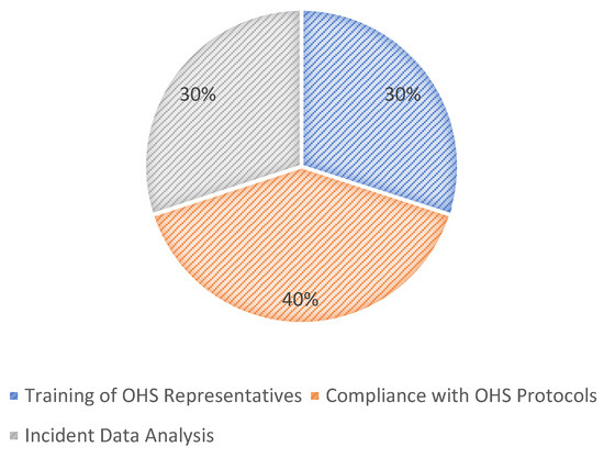 When assessing the performance of the university’s OHSMS, only a small number of respondents identified the training of OHS representatives as a crucial factor. While this was not widely recognized by participants, it highlights a potential gap in awareness regarding the role of training in effective OHSMS implementation. As illustrated in Figure 10, the most commonly cited performance indicators included the level of compliance with OHS protocols (40%), especially as assessed by the severity of concerns raised by OHS committees such as issues related to infrastructure maintenance. In addition, 30% of respondents reported relying on incident data (including the number and types of injuries or illnesses) as a key metric for evaluating the OHSMS. This included tracking injury severity, frequency, and identifying recurring hazards over time. Finally, the university’s quarterly injury statistics were also considered a meaningful indicator of actual harm experienced on campus, providing insight into how well OHS risks are being managed. Subhani [8] emphasized the importance of structured monitoring and measurement in determining the OHSMS’s effectiveness, noting that the absence of formal procedures, audits, and data analysis can render the system ineffective. Similarly, Esterhuyzen [33] stressed that ongoing monitoring, safety audits, and reviews are essential practices that support legal compliance, informed decision-making, and continuous improvement. These findings point to the need for more robust and consistent performance monitoring systems within the university’s OHSMS, moving beyond basic reporting towards a culture of proactive and data-driven safety management.