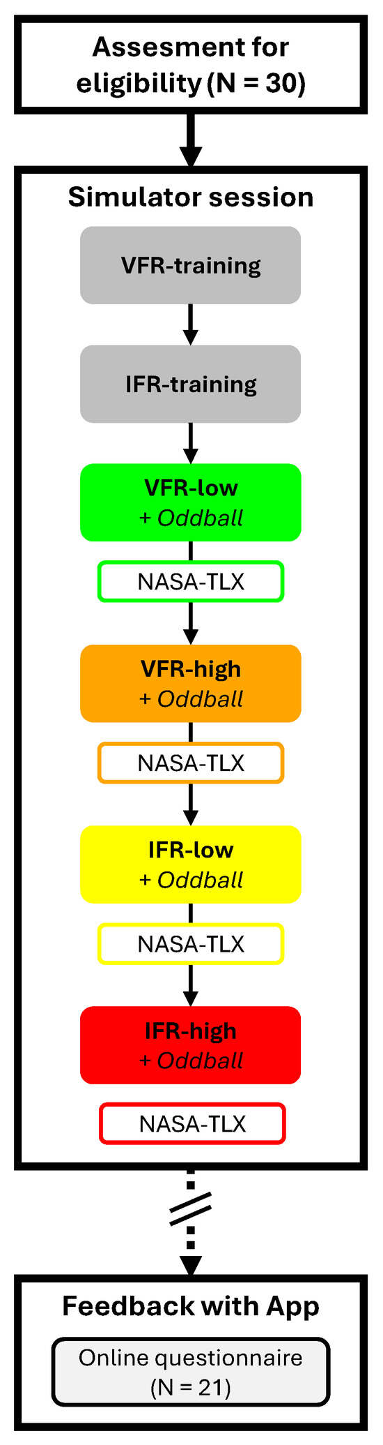 In order to provide performance metrics in various flight scenarios, we first had to design and validate traffic patterns with different workload levels. These were designed taking into account the multiple resource theory [29], which postulates that workload and task performance are based on three factors: (1) the difficulty of each task component (e.g., failure vs. no failure during flight); (2) the allocation of resources to task components (e.g., instrument landing vs. visual landing); (3) the extent to which tasks require shared attentional resources (e.g., adding a concurrent oddball task during the flight). We created four flight simulation scenarios reflecting these factors: VFR (Visual Flight Rule) vs. IFR (Instrument Flight Rule) and Low vs. High difficulty (good weather vs. bad weather/system failures). Workload indicators were measured subjectively (NASA-TLX [15]) and objectively (miss rate in a concurrent auditory oddball task [30]). Based on the predictions of the multiple resources theory, we expected the workload to be highest in the IFR-high condition and lowest in the VFR-low condition.