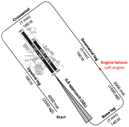Illustration of the traffic pattern in the IFR-high scenario (not to scale). The pilots had to perform a night landing in low visibility, after an engine failure during the downwind phase. msl: mean sea level; agl: above ground level; kt: knots.