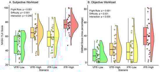 The 40% oddball miss rate (objective workload) in the IFR-high condition is lower than the 50–60% reported in previous studies [14,40], likely because engine failure was introduced only in the latter half of the IFR-high scenario. Furthermore, our experimental setup was inherently less stressful than these previous studies [14,40], which involved the use of actual smoke within the cabin to simulate a failure scenario and included the silent presence of flight instructors, thereby introducing additional psychological and social stress factors. In any case, these high percentages can be related to very high mental workload, and may be explained by degraded mental states such as attentional tunneling or inattentional deafness [41,42].