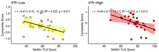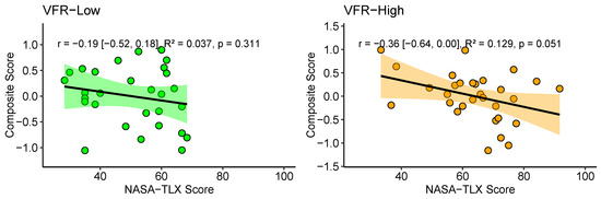 All correlations between the Composite Score and the NASA-TLX are shown in Figure 7, and were negative, ranging from −0.19 to −0.47. These correlations were significant in the IFR conditions at both Low (p = 0.011) and High difficulty levels (p = 0.013). Although the negative correlations are in line with our hypotheses, they were only significant in the IFR conditions, thus partially supporting our hypotheses.