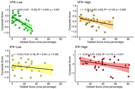 All correlations between the Composite Score and the oddball miss percentage are shown in Figure 8 and were negative, indicating a consistent inverse relationship across conditions, with values ranging from −0.20 to −0.63. This relationship reached statistical significance only in the VFR-low condition (p = 0.001), and was near significant for VFR-hard and IFR-hard (p = 0.065 and p = 0.071, respectively).