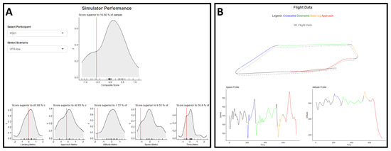 After data acquisition, an online application was developed in R Studio [35], using the shiny-package to create a Shiny app 1.7.5. This application was designed to interactively display various flight parameters (e.g., speed and altitude profiles, flight path in 3D) per scenario. It also integrates the previous described metrics, the composite score and its sub-scores, as well as the objective and subjective workload indicators. Data visualization within the application is facilitated through the use of density plots, which provide a comprehensive view of the distribution of scores across participants. The individual’s performance is indicated on the graph by a vertical red line. This feature enabled participants to easily compare their results with those of the sample, facilitating a deeper understanding of their skills and areas for improvement. The Shiny app 1.7.5 code is open source and available here [36]. The application link was shared with the pilots once they all completed the experiment, and is available here [37].