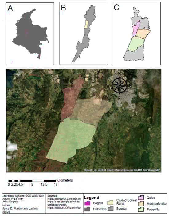 The study was conducted in Ciudad Bolívar, a territorial subdivision of Bogotá that is 75% rural []. The locality comprises three rural zones—Mochuelo Alto, Quiba, and Pasquilla—which were selected for this study due to their strong agricultural traditions and extensive farmland (Figure 1). Furthermore, the collaboration with community leaders, who provided valuable insights and facilitated access to other farmers, was instrumental in carrying out the research.