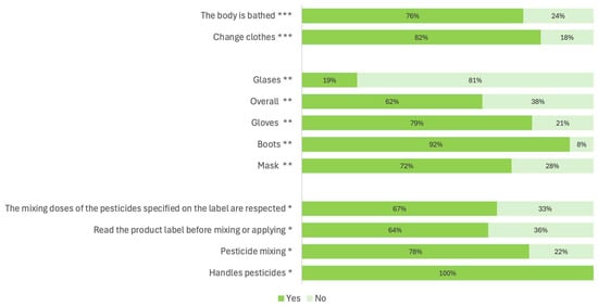 Use of pesticide *, hygiene habits **, and use of personal protective equipment (PPE) ***.
