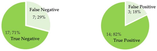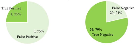 Initially, regression analysis was conducted on an imbalanced dataset, where the number of non-intoxicated cases (77) was nearly four times higher than intoxicated cases []. This imbalance influenced the regression model, leading to a confusion matrix (Figure 3) that improved the prediction of factors associated with intoxication (Table 3). The model achieved a 79% accuracy in predicting intoxication events; however, statistical evidence for specific risk factors remained inconclusive. The coefficient estimates demonstrated an inverse relationship between intoxication and the use of protective measures, but with a low correlation (p = 0.2439) (Table 4).