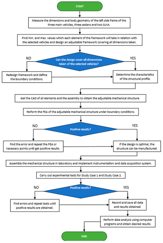 The experimental prototype for curtain airbags has been developed to simulate the side frame structure of a vehicle, with its design grounded in the dimensions and geometry of that structure. The primary objective of this design is to facilitate performance testing of curtain airbags while minimizing the reliance on destructive impact tests and installations within test vehicles. An adjustable mechanical structure was designed to enable the evaluation of a broader range of curtain airbags by allowing for their mounting on the structure. After finalizing the design of the adjustable mechanical structure, its components were fabricated, and by assembling these fabricated elements, the frame of the adjustable mechanical structure was constructed. This structure was then integrated with the necessary instrumentation and data acquisition system to form the complete experimental prototype for curtain airbags. Figure 1 presents a flowchart illustrating the design proposed for the experimental testbed. It summarizes the sequential stages—from the determination of vehicle dimensions and geometries through CAD modeling and numerical evaluation to the fabrication and experimental testing—demonstrated with two case studies.