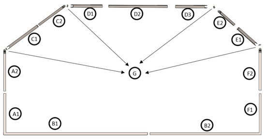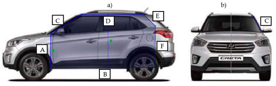Figure 2, Figure 3 and Figure 4 illustrate the silhouette that defines the geometry to be adopted by the experimental prototype for curtain airbags. Each line segment in the silhouettes, drawn from the front and side views of the vehicle, is annotated with a specific nomenclature. Table 2 details the meaning of each letter in the nomenclature used in Figure 2, Figure 3 and Figure 4, integrating the dimension and position values for the three main selected vehicles. This approach facilitates a comprehensive understanding and helps determine the dimensions of the adjustable mechanical structure proposed in the prototype design.