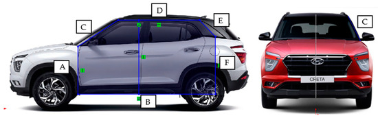 Hyundai Creta 2022 front and side view with measurement silhouette. Letter A refers to the Front arm, B to the Floor arm, C to the Windshield arm, D to the Canopy arm, E to the Rear upper arm, and F to the Rear lower arm.