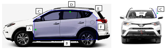 Toyota RAV4 2018 front and side view with measurement silhouette. Letter A refers to the Front arm, B to the Floor arm, C to the Windshield arm, D to the Canopy arm, E to the Rear upper arm, and F to the Rear lower arm.