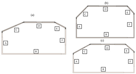 Mechanical structure was obtained using the dimensions of the three main vehicles selected. (a) Hyundai Creta 2019, (b) Hyundai Creta 2022, and (c) Toyota RAV4 2018. Letter A refers to the Front arm, B to the Floor arm, C to the Windshield arm, D to the Canopy arm, E to the Rear upper arm, and F to the Rear lower arm.