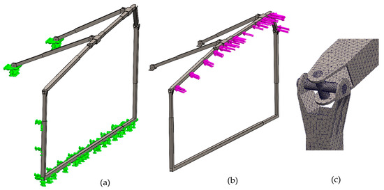 Main FEM boundary conditions. (a) Fixed supports in green arrows, (b) applied force (airbag deployment) in pink arrows, and (c) fine mesh control.