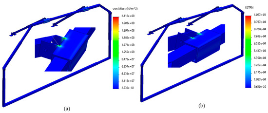 The numerical evaluation results can be seen in the example presented in Figure 8, which represents the Hyundai Creta 2019 FEM analysis. Figure 8a shows that most of the mechanical structure and the adjustable clamps present stresses of around 21.11 MPa, which is well below the permissible or elastic stress limit of 250 MPa. However, there are areas, such as the sliding joint of the adjustable clamps and the joint of their brackets with the telescopic arm of the adjustable clamp, that present higher stress values of around 195 MPa. The unitary deformation values of the Solidworks® 2021 SP5.0 scale show that the model remains well below the unit, even in critical areas, as Figure 8b shows.