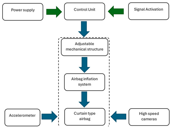 In contrast, the Experimental Testbed proposed in this study is specifically designed to overcome these limitations by providing a nondestructive, flexible, and scalable methodology for evaluating curtain airbag systems under realistic conditions. The design process begins with the geometric and dimensional analysis of the side frame structures of multiple vehicle models. From this, an adjustable mechanical structure was engineered, capable of adapting to vehicle segments B, C, D, and E, thus covering a broad portion of the automotive market. Integrated with an advanced control and instrumentation system, the testbed enables repeated and precise testing of curtain airbag deployments. This platform facilitates a detailed analysis of deployment performance and occupant interaction, particularly for child passengers in side impact scenarios. By minimizing the need for destructive crash tests, this experimental system presents a valuable and cost-effective alternative for improving safety evaluations and supporting future design optimization of passive safety systems.