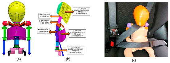 For this purpose, a specially designed infant mannequin, modeled after the Humanetics® Q3, was employed. Given the cost of a standard Q3 mannequin (up to 2 million euros), a replica was produced using three-dimensional printing, advanced sensors, and wireless data acquisition systems to enhance data collection. Figure 10 displays the design of the Q3 mannequin. This prototype mannequin was physically conceptualized using 3D printing, and PLA (Polyvalent Acid) was used. Once the prototype mannequin was printed, its lining was manufactured using a Mold Max 10T silicone and specially designed and manufactured molds. The material is composed of translucent tin-cured silicone rubber and is a good alternative for creating human skin effects. Figure 10 shows an image of the mannequin used where it is positioned in the rear seats of a vehicle. It can be seen that it corresponds to a size similar to that of a 3-year-old child.