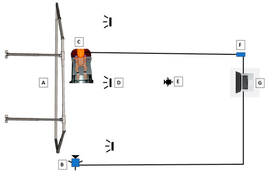 Distribution of the experimental prototype for curtain airbags. Letter A refers to the adjustable mechanical structure, B to the high-speed camera, C to the dummy, D to illumination elements, E to the GoPro camera, F to the data acquisition system, and G to the mobile computer.