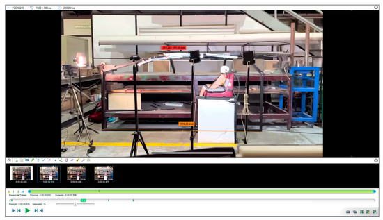 As shown in Table 5, the curtain airbag begins deploying at 787 ms and continues to inflate for 29 ms, reaching a level of inflation sufficient to initiate occupant protection, as demonstrated by the dummy used in the test. However, contact between the airbag and the dummy’s head occurs at 818 ms, 36 ms after deployment started. The airbag continues inflating, albeit at a reduced rate, until 849 ms and remains fully inflated until 1096 ms, resulting in a total inflation duration of 314 ms. Additionally, deployment time and speed measurements were conducted using the Kinovea® 0.8.27 software. Motion analysis was performed by placing a tracking point on the airbag to measure its deployment trajectory. This tracking allowed for the determination of the curtain airbag’s deployment speed and timing. Figure 12 shows a line drawn on the arm of the adjustable mechanical structure to scale the video environment, ensuring the software can calculate the measurements more precisely, along with the placement of the trajectory tracking point on the curtain airbag.