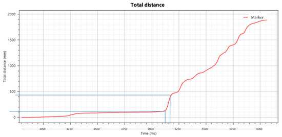 Tracking point displacement graph. Blue lines are reference elements to identify the values of Distance and Time.