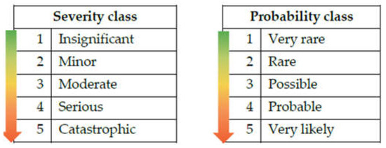 Each identified risk factor [9,10] was analyzed and classified according to potential severity/impact and probability of manifestation [1] according to a scale consisting of 5 distinct classes (1–5), as shown in Figure 2 and Table 1 and Table 2: