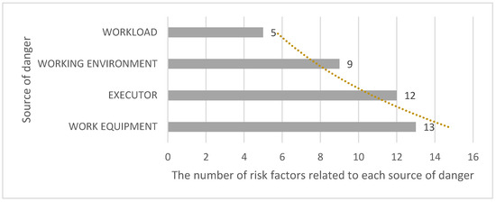 The two sources of danger, work equipment (33%) and human factors (executor) (31%), account for 64% of the total risk factors identified. This indicates the need for priority measures in this direction. The working environment (23%) and workload (13%) are also important sources, but with a lower weight. Based on these findings, prevention and protection measures should be directed with priority toward equipment safety, personnel training, and the optimization of working conditions in order to reduce risks and improve workplace safety.