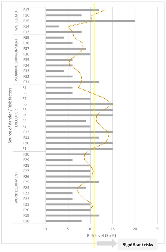 The risk level can range from 1, representing the lowest risk level, to 25, indicating the highest risk level. The calculated score allows for the systematic classification of risks, providing an objective basis for prioritizing them according to the degree of danger (Figure 4).
