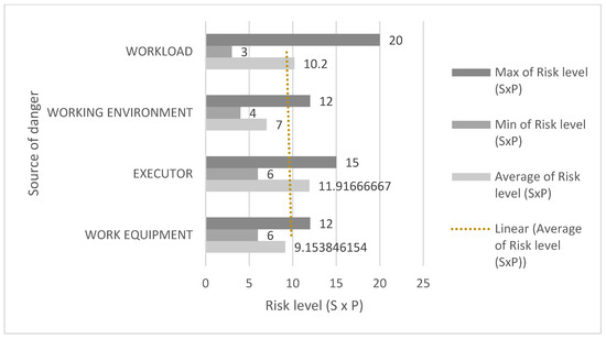 The weight of risk factors [11,15,16] corresponding to different sources of danger, as shown in Figure 5, constitutes an important indicator in the process of analyzing and assessing occupational risks. This distribution provided a clear insight into the relative contribution of each hazard source to the overall risk level, thus facilitating a systematic approach in identifying the most critical threats to worker safety and health.