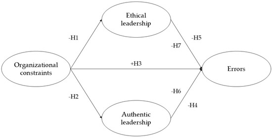 Model of the variables studied. Notes: H1: high levels of OCSs have a negative relationship with nurses’ perception of their head nurses’ ethical leadership style; H2: high levels of OCSs have a negative relationship with nurses’ perception of their head nurses’ authentic leadership style; H3: high levels of OCSs in organizations have a positive relationship with errors within healthcare organizations; H4: the authentic leadership styles of head nurses have a negative relationship with errors in healthcare organizations; H5: the ethical leadership styles of head nurses have a negative relationship with errors in healthcare organizations; H6: the authentic leadership styles of head nurses have a mediating role in the relationship between OCSs and nurses’ errors; H7: the ethical leadership styles of head nurses have a mediating role in the relationship between OCSs and nurses’ errors.