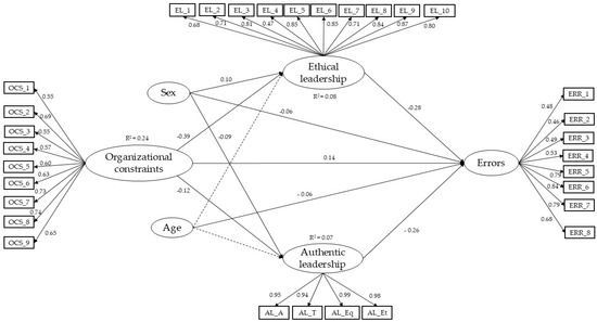 Results of the structural equation model. Notes: OCS = organizational constraint scale; EL = ethical leadership; AL = authentic leadership; ERR = error. Dotted lines are not statistically significant relationship.
