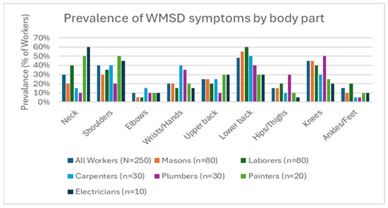 Figure 1 and Table 2 present the prevalence of musculoskeletal pain categorized according to body region and occupational type. Overall, 48% of the workers reported experiencing lower back pain, which was the most affected region, followed by knee pain (45%) and shoulder pain (40%). Within specific trades, 60% of the laborers and 55% of the masons reported lower back pain, suggesting a significant correlation with tasks involving heavy manual handling. Neck pain was most prevalent among electricians (60%) and painters (50%) and was likely attributable to prolonged overhead work. Carpenters demonstrated the highest prevalence of wrist and hand pain at 40%, which aligns with the precision and repetitive nature of tool use in their work.