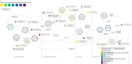 Across all functions, the average function was mentioned 3.8 times (SD = 1.8) with little difference between foreground functions (M = 3.7, SD = 1.8) and background functions (M = 3.8, SD = 1.8). The functions in some steps in the process were mentioned more often than others. The 11 functions in the outpatient clinic (step 1) were on average mentioned 4.4 times (SD = 2.0), the 9 functions of the preoperative screening (step 2) were mentioned 3.1 times (SD = 1.6), the 6 functions of planning (step 3) were mentioned 3.3 times (SD = 2.3), and the 7 functions in patient admission (step 4) were mentioned on average 4 times (SD = 1.4). This shows that functions in the outpatient clinic were mentioned most but that there was most variation in how often functions were mentioned in the planning.