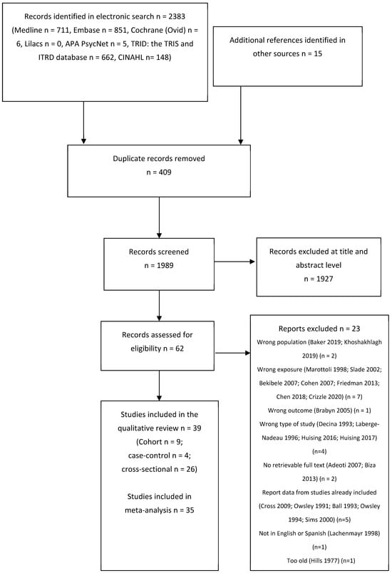 The initial search yielded 2398 results, and after excluding duplicates and checking compliance with the selection criteria, 39 articles were selected (Figure 1). Of the studies included in the qualitative synthesis, 35 were combined into different meta-analyses based on the visual function analysed, the type of observational study, and the measure of association reported. Five of the selected studies were not finally included in the quantitative synthesis, either because they did not report data for exposed and injured subjects in their results [13,14,15], or because they did not report data for unexposed subjects [16], or because the authors reported visual acuity results as mean and standard deviation rather than as categorical data comparable to the other studies [17].