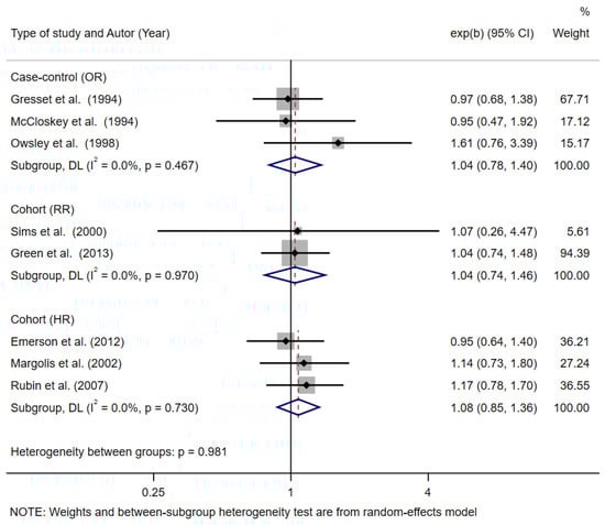 Estimates of association (OR, RR, PR, and HR) and their 95% confidence intervals (CIs) were combined using random-effect models (DerSimonian–Laird method). Statistical heterogeneity was assessed using the I2 test, which was considered high when >75% [12]. Publication bias was estimated using Egger’s regression method for subgroups with at least 10 studies.