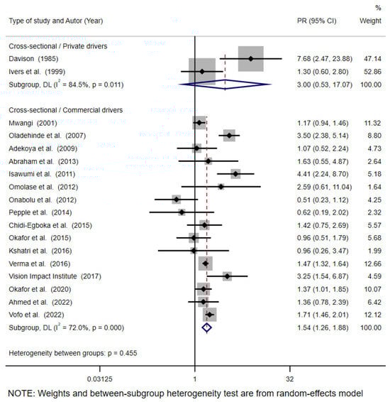 This systematic review and meta-analysis identified the risk of RTA based on the status of several visual functions that are assessed in common driving tests, which is specifically related to ocular pathology. A small number of cohort or case–control studies were found and were conducted in high-income countries and in populations of older adults. Conversely, cross-sectional studies have been conducted in low- and middle-income countries, often involving public service drivers, and the subjects have been predominantly male. This finding reflects the interest in issues related to the licencing of commercial drivers, who have very high exposure to driving, often in heavy traffic conditions. The other group of interest has been older adults with physical and functional comorbidities. There has been one review of the impact of visual function in the general population [14,47] and only three of the studies [25,38,41] have assessed motorcyclists. Studies conducted in commercial drivers or older adults could not be extrapolated to other types of drivers.