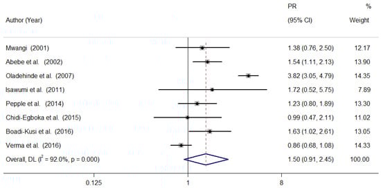 The meta-analysis was performed with eight cross-sectional studies and found no increased risk of RTA with abnormal colour vision (PR 1.50, 95% CI 0.91–2.45; I2 = 92.0%; n = 4367); there was a considerable degree of heterogeneity (Figure 4).