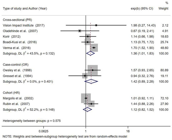 Forest plot of risk of road traffic accident (police-reported) among private drivers with reduced visual acuity by type of observational study [19,21,22,23,24,27,28,29].