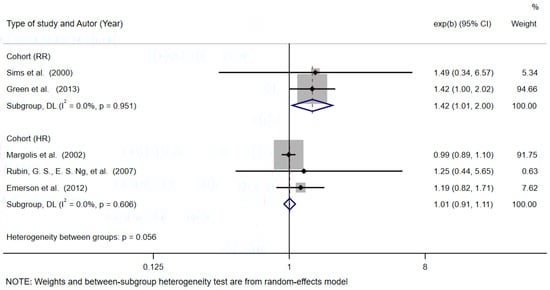 Three cross-sectional studies reported contrast sensitivity data [14,31,48] but did not assess the association with accident rates. A small risk of RTA was seen in older adults with impaired contrast sensitivity and in cohort studies reporting the cumulative incidence (RR 1.42, 95% CI 1.01–2.00; I2 = 0.0%; n = 2172), but not in those reporting HR (HR 1.01, 95% CI 0.91–1.11; I2 = 0.0%; n = 3313) (Figure 6).