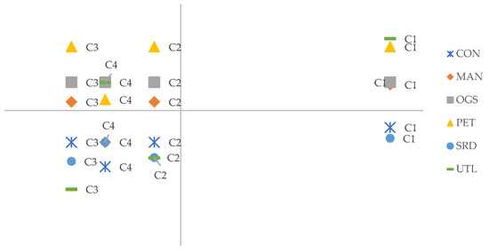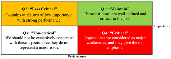 The IPA approach maps individuals’ judgments of performance and the importance of a certain component onto a two-dimensional chart, making the data easier to analyze [57]. The chart classifies the attributes into four quadrants, as depicted in Figure 1. Each quadrant represents a unique technique for supporting managers in understanding both the shortcomings and the essential actions for improvement. The x-axis defines the “importance” of the aspects, which is defined as the weights obtained from the AHP method. The y-axis represents the “performance” of the aspects, which is defined as the evaluation of the experts obtained from the TOPSIS method [58].