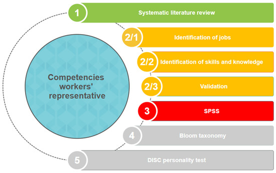 The research was conducted in multiple phases. The steps of the research are presented in Figure 1. First, a systematic literature review was performed using the PRISMA (Preferred Reporting Items for Systematic Reviews and Meta-Analyses) method to identify the competencies and their components as expected by professionals. The tasks of workers’ representatives in the field of OSH were identified based on the results of the systematic literature review and relevant legislation [28].