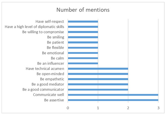 The five most important traits, according to the responses, were equally rated for good communication and good problem-solving, as well as for diplomatic sense and good technical sense. The order of the votes received for all components of traits of workers’ representatives in the field of OSH is presented in Figure 6. Similarly, assertive communication, quick situational awareness, good conflict resolution, and compliance with OSH procedures (aligned with ISO 45001 [36], including MOC practices) were equally rated.