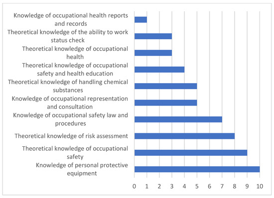 Based on the responses, the five most important components were knowledge of personal protective equipment, theoretical knowledge of occupational safety, theoretical knowledge of risk assessment, knowledge of occupational safety law and procedures, and an equal number of votes for knowledge of occupational representation and consultation, as well as for theoretical knowledge of handling chemical substances. The order of the votes received for all components of occupational safety knowledge is presented in Figure 4.