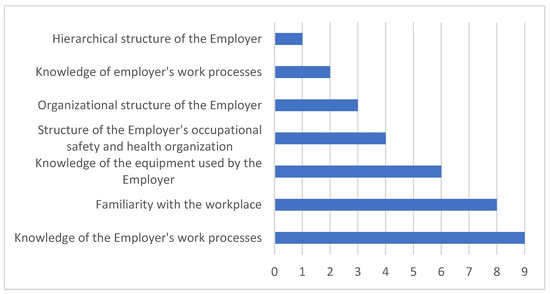 After processing, it was determined that the three most important workplace skills were knowledge of employer’s work processes, familiarity with the workplace, and knowledge of equipment used by the employer. The order of the votes received for all components of professional knowledge is presented in Figure 5.