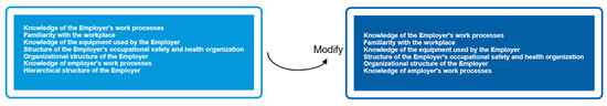 The components of professional knowledge (Knowledge of the Employer’s work processes, Familiarity with the workplace, Knowledge of the equipment used by the Employer, Structure of the Employer’s occupational safety and health organization, Organizational structure of the Employer, Knowledge of employer’s work processes, and Hierarchical structure of the Employer) identified define the training tasks of employers. Components that show a close similarity to each other should be merged, allowing for the modification of the identified elements of professional knowledge. The modification is shown in Figure 7.